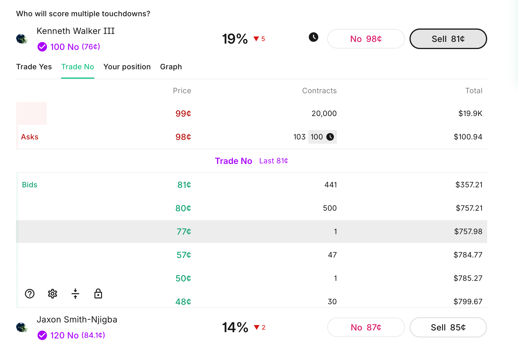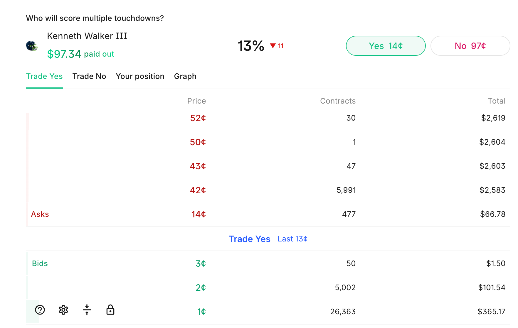 So it was the middle of the first quarter, and Kenneth Walker had 0 touchdowns. But the NO contract (betting he wouldn't score 2) had a bid at 51¢ and an ask at 94¢. Pre-game, that contract was worth about 76¢.