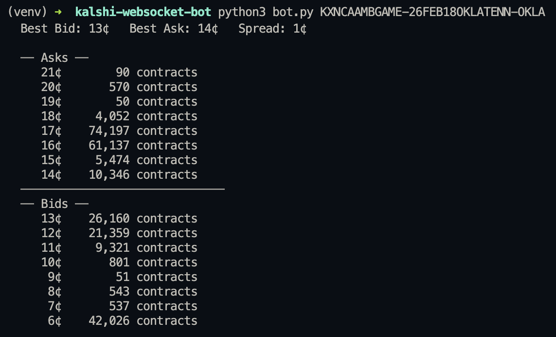 This tutorial builds the tools that makes that possible. We'll connect to the Kalshi websocket API and build a real-time orderbook viewer from scratch, starting with the simplest possible websocket connection and layering on functionality until we have a full orderbook display with live bid/ask/spread tracking. Then in part 2, we'll place actual orders.