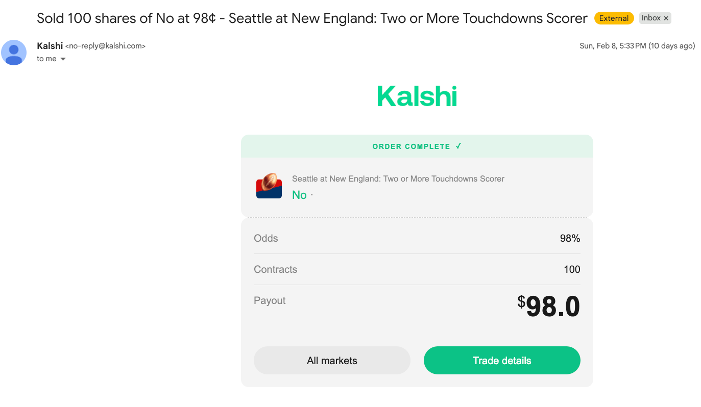 During the Super Bowl, I was on a flight from SFO to Mexico City. Bad planning, I know. I didn't have a TV to actually watch the game, just airplane wifi and a laptop. I pulled up the Kalshi orderbook for my Kenneth Walker and JSN 2 TD+ prop bets that I placed earlier in the week. They were both NO bets obviously. We've been discussing how longshot bets are overpriced and generally dumb, even though they are the most discussed bets on sports podcasts and are very popular among retail traders.