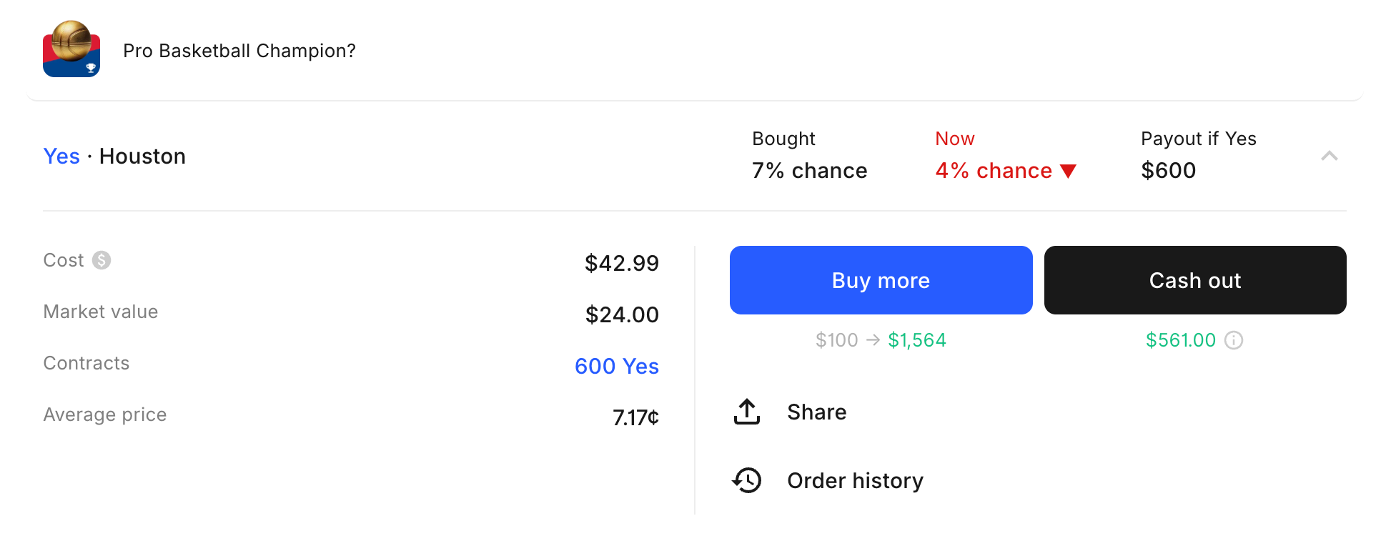 Likewise, in sports, which is the #1 category for traders on Kalshi, it is common to bet on your favorite team to win it all, however unlikely that may be. I'm even guilty of this. I was born in the Houston area, so of course before the NBA season started I bought 7 cent contracts for the Houston Rockets to win the NBA Championship. The $40 bet would pay $600 if it hit, and I could show off to everyone on the internet that I was the one who called it.